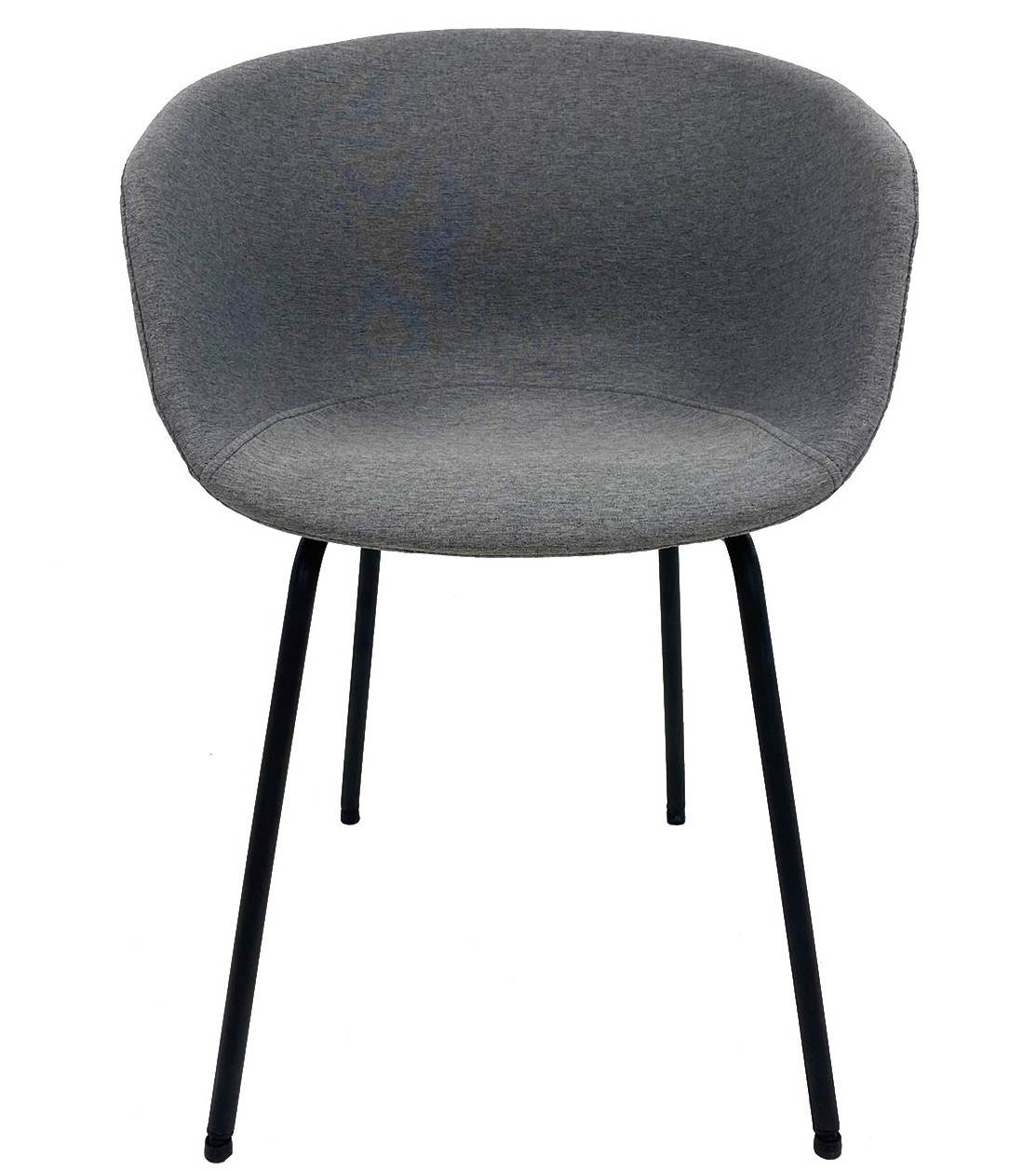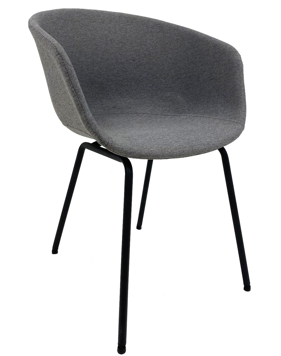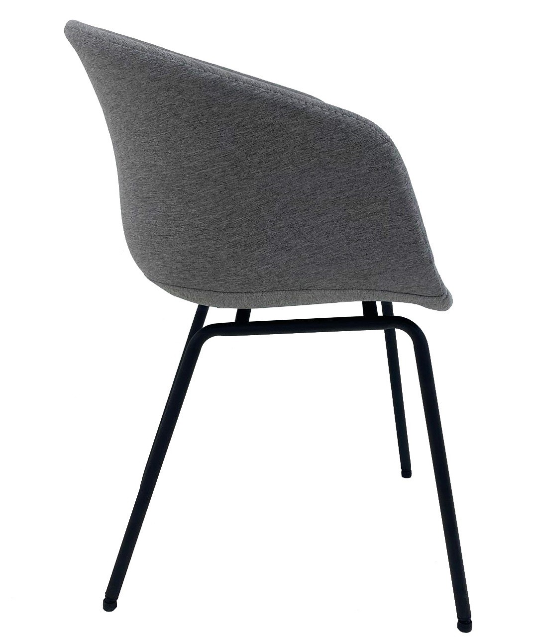 Sillón de diseño, armazón metálico con acabado epoxi negro, asiento y respaldo tapizados en tejido gris claro. Taburete a juego