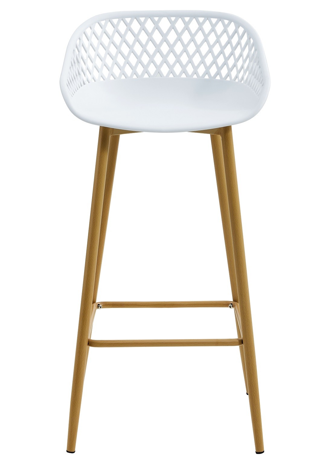 Taburete de diseño, base de metal con acabado imitación madera, asiento y respaldo de polipropileno inyectado de color blanco. Otros colores disponibles. Silla y sillón del mismo color