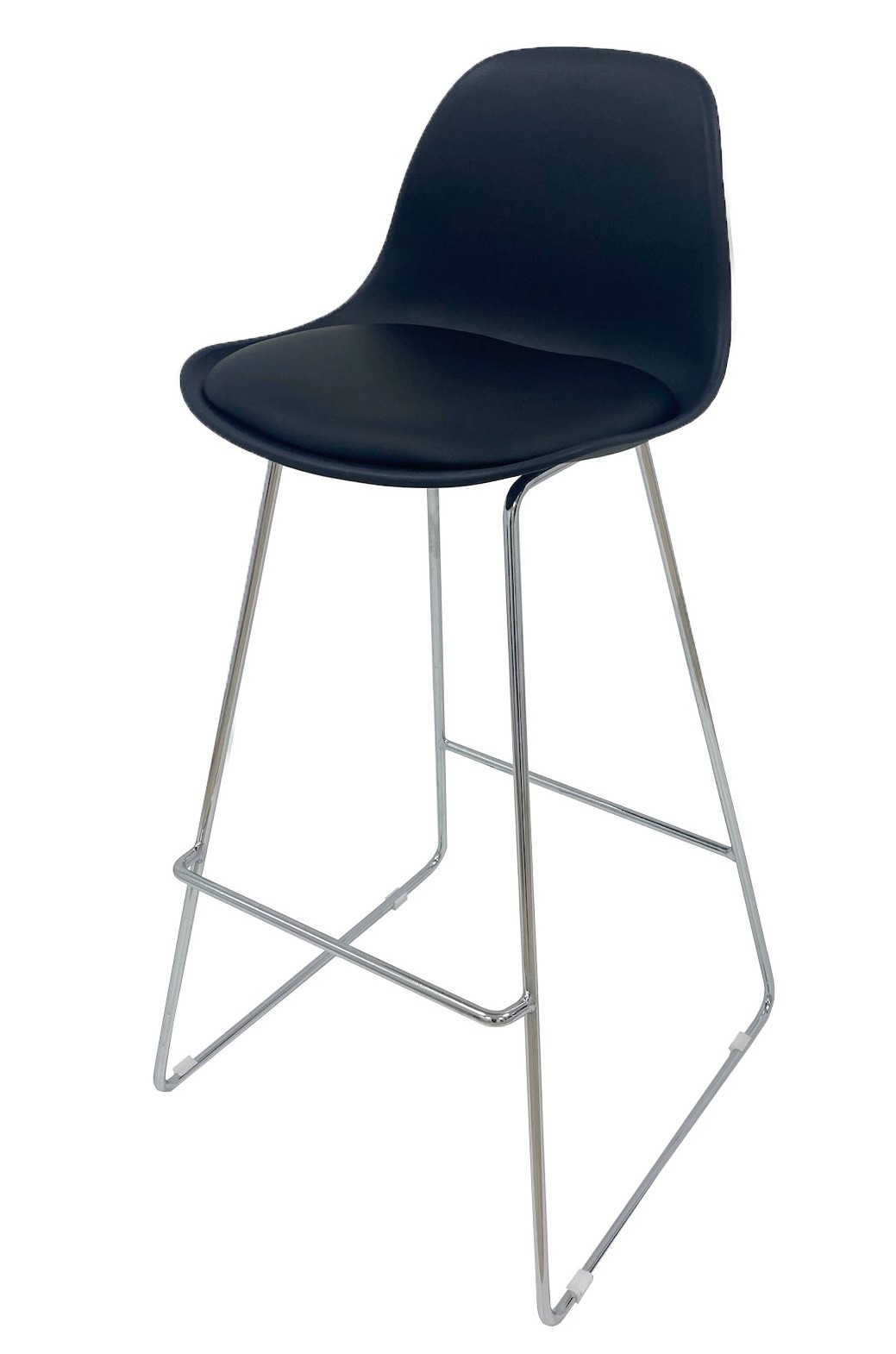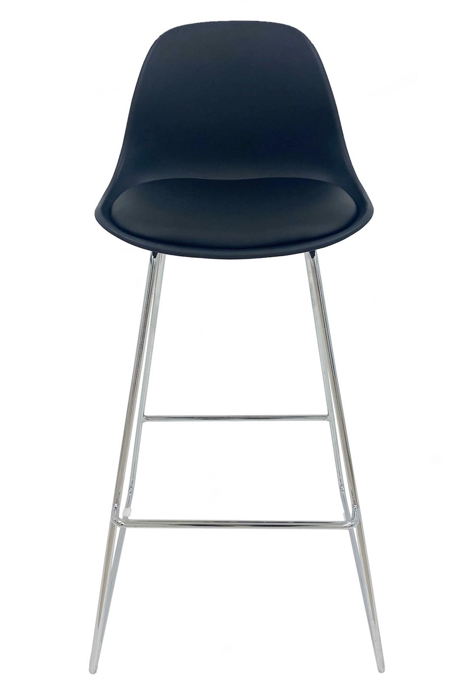 Taburete de diseño, cromado, carcasa negra con asiento tapizado en similpiel negra. Otros colores disponibles.